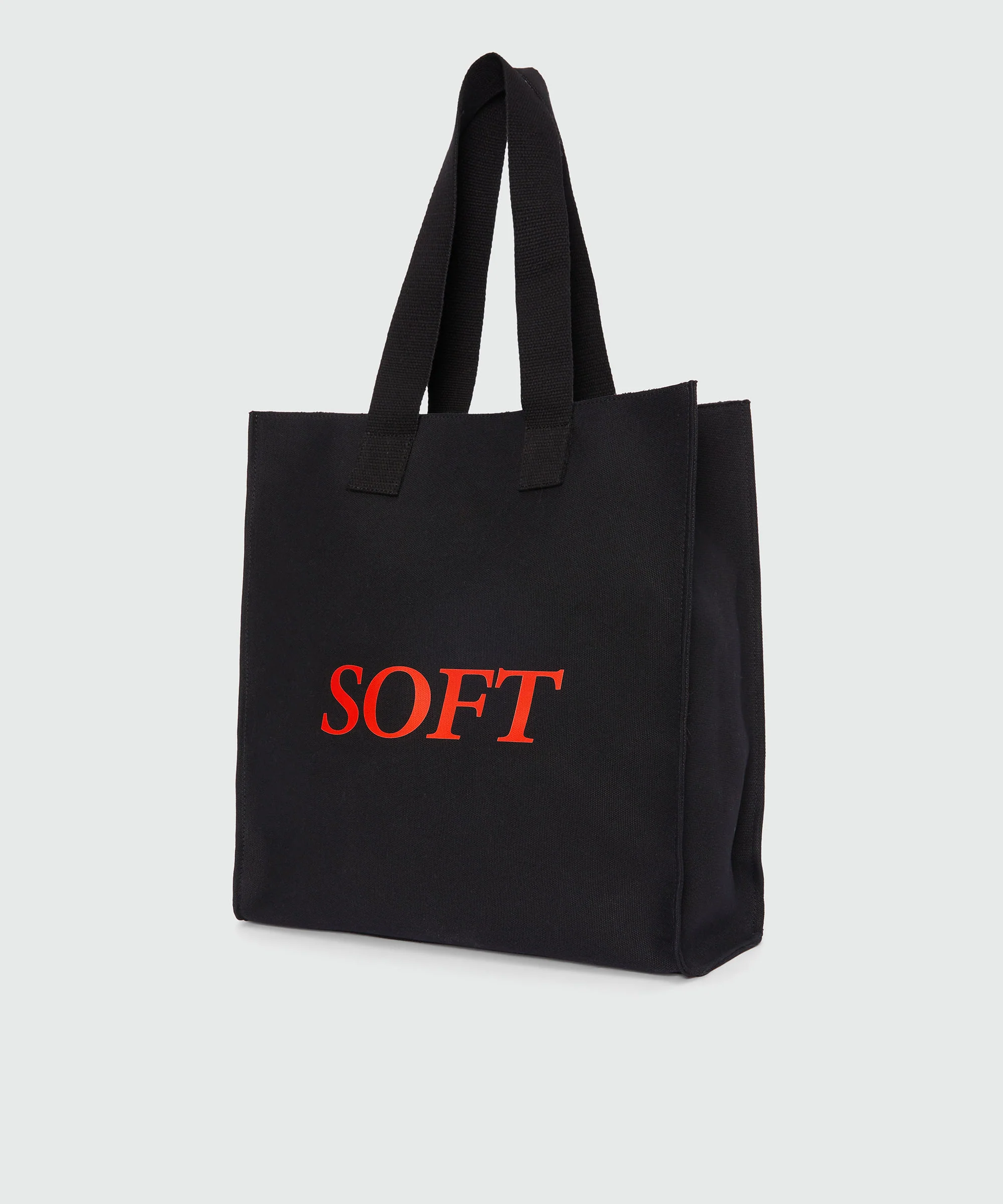 Black canvas tote with "Soft" print and lettering