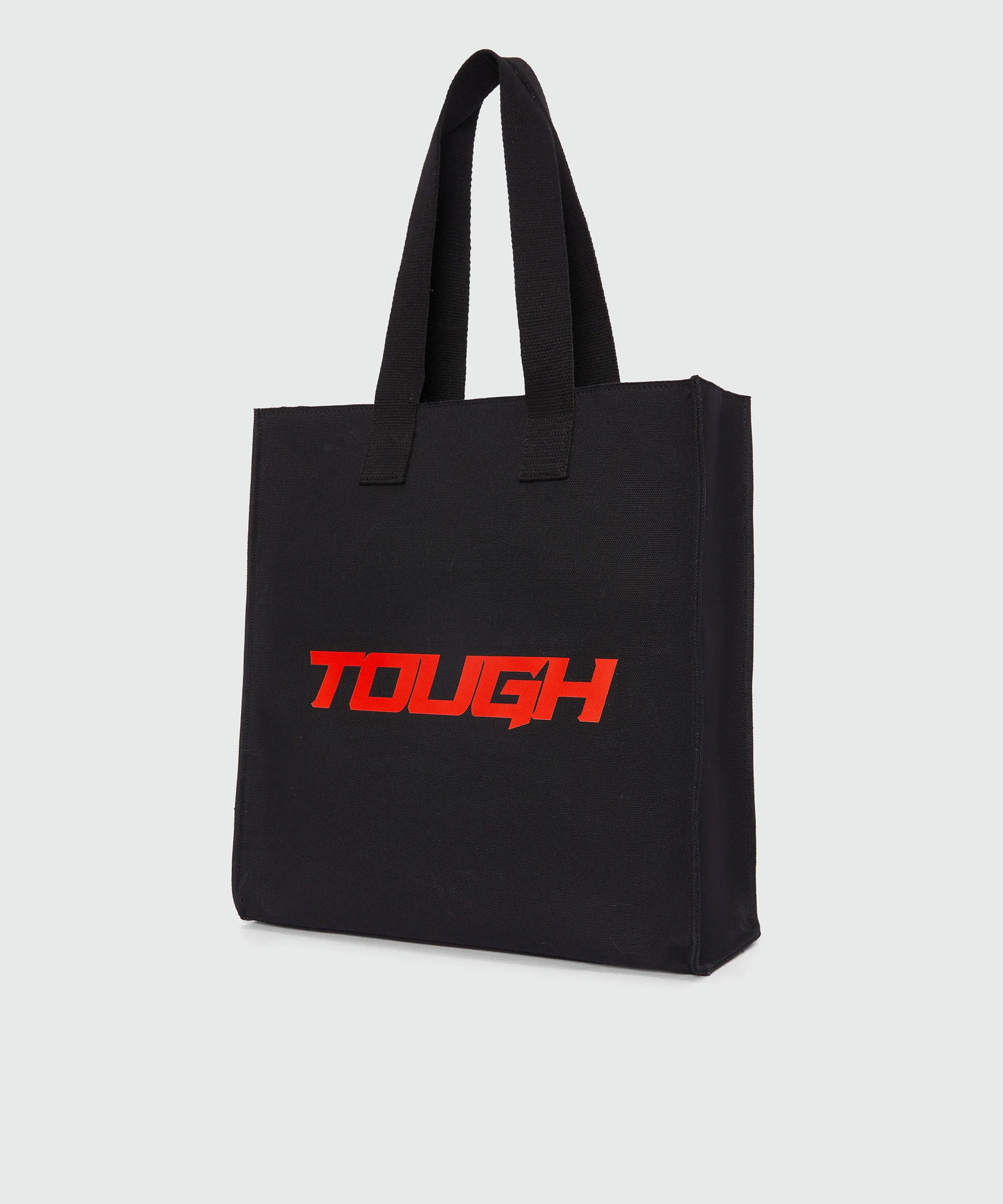 Canvas tote with contrasting "Tough" print on the front and lettering on the back. Double grosgrain handles.