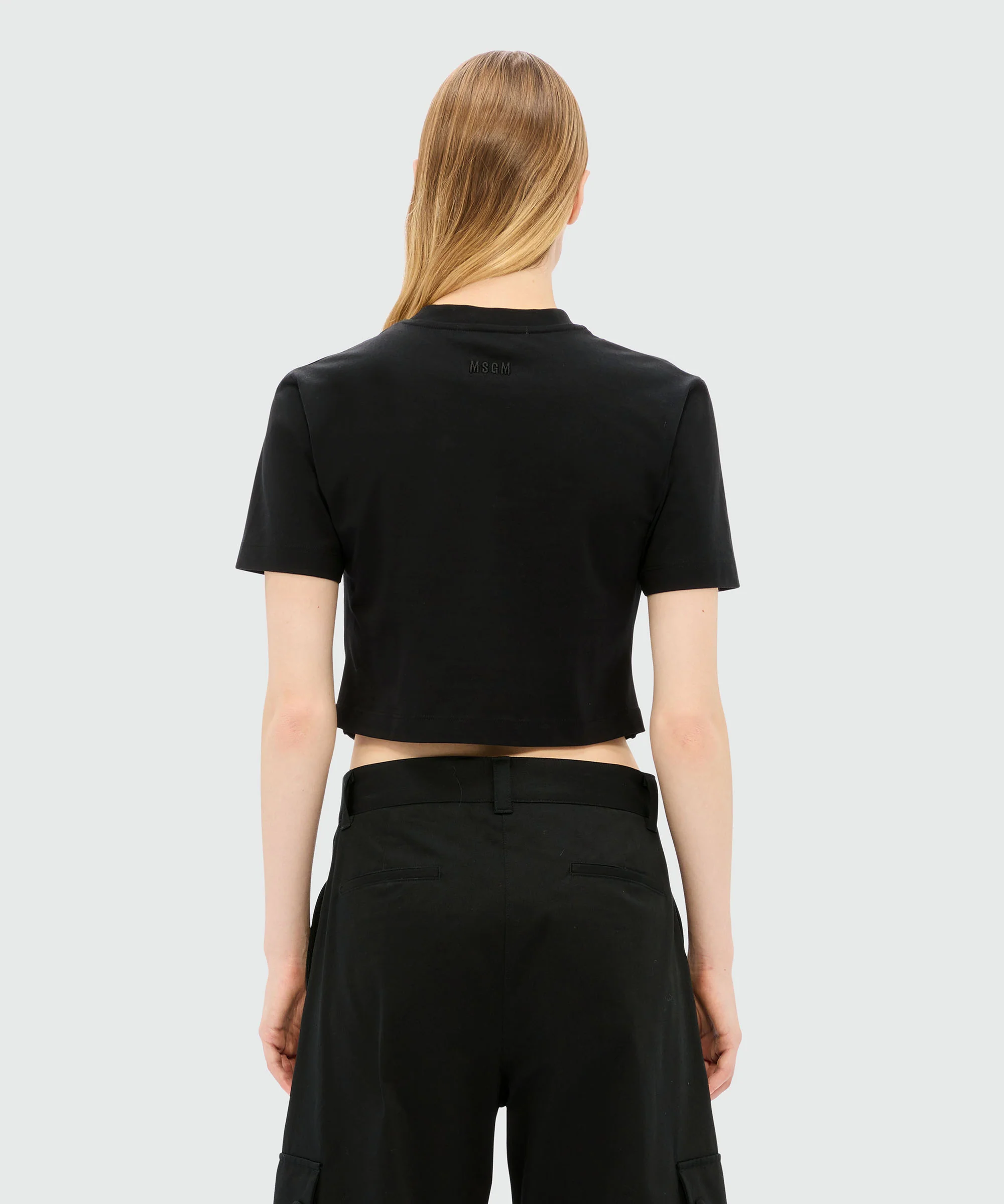 Cropped cotton jersey T-shirt with a center zip and gathered detailing for a draped effect. Crew neck, short sleeves, tone-on-tone embroidered MSGM logo on the back. Slim fit. The model is wearing size S/40.