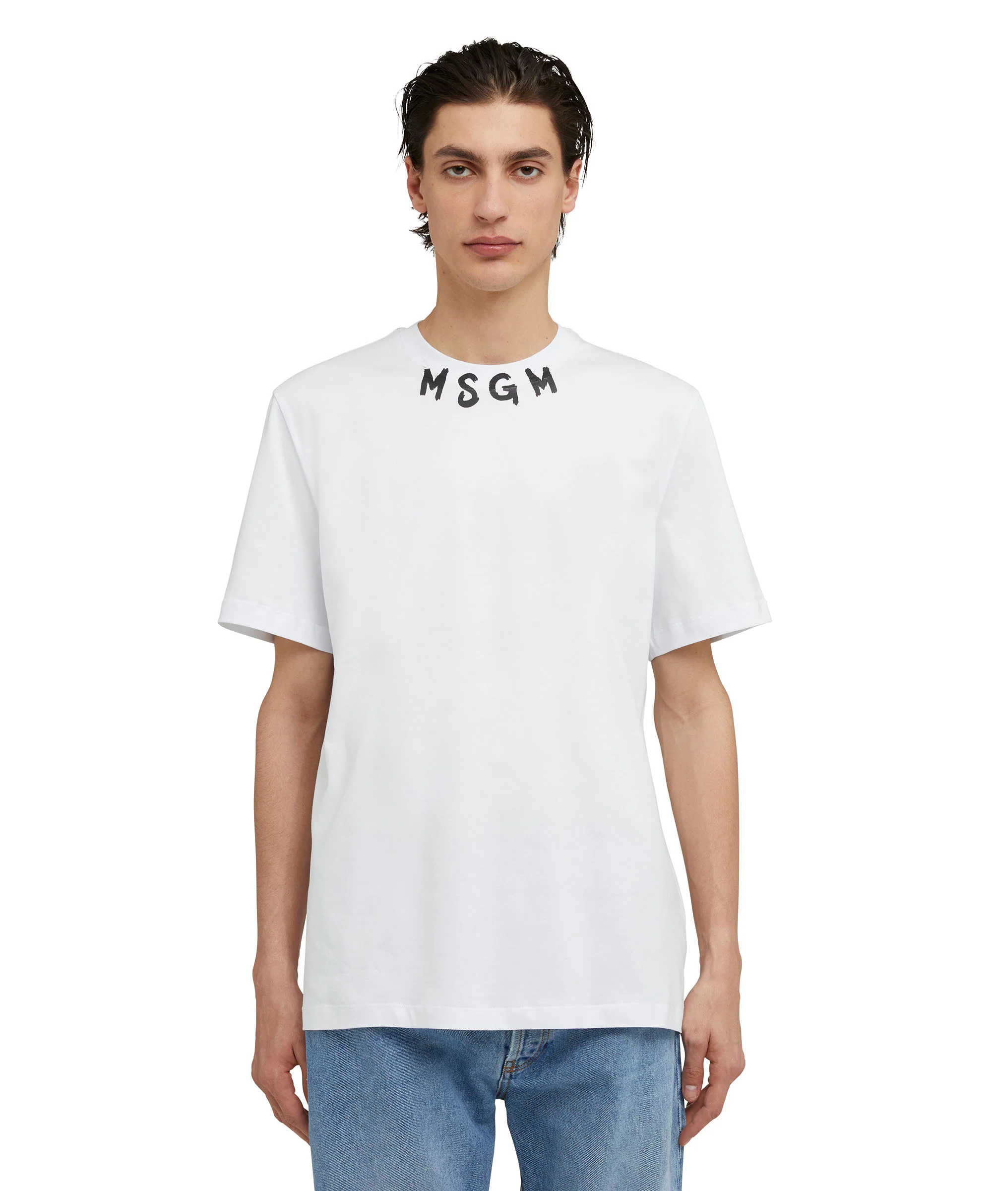 Solid color cotton crewneck t-shirt with contrasting color brushed MSGM logo at the neckline. Short sleeves and ribbed collar. Regular fit.