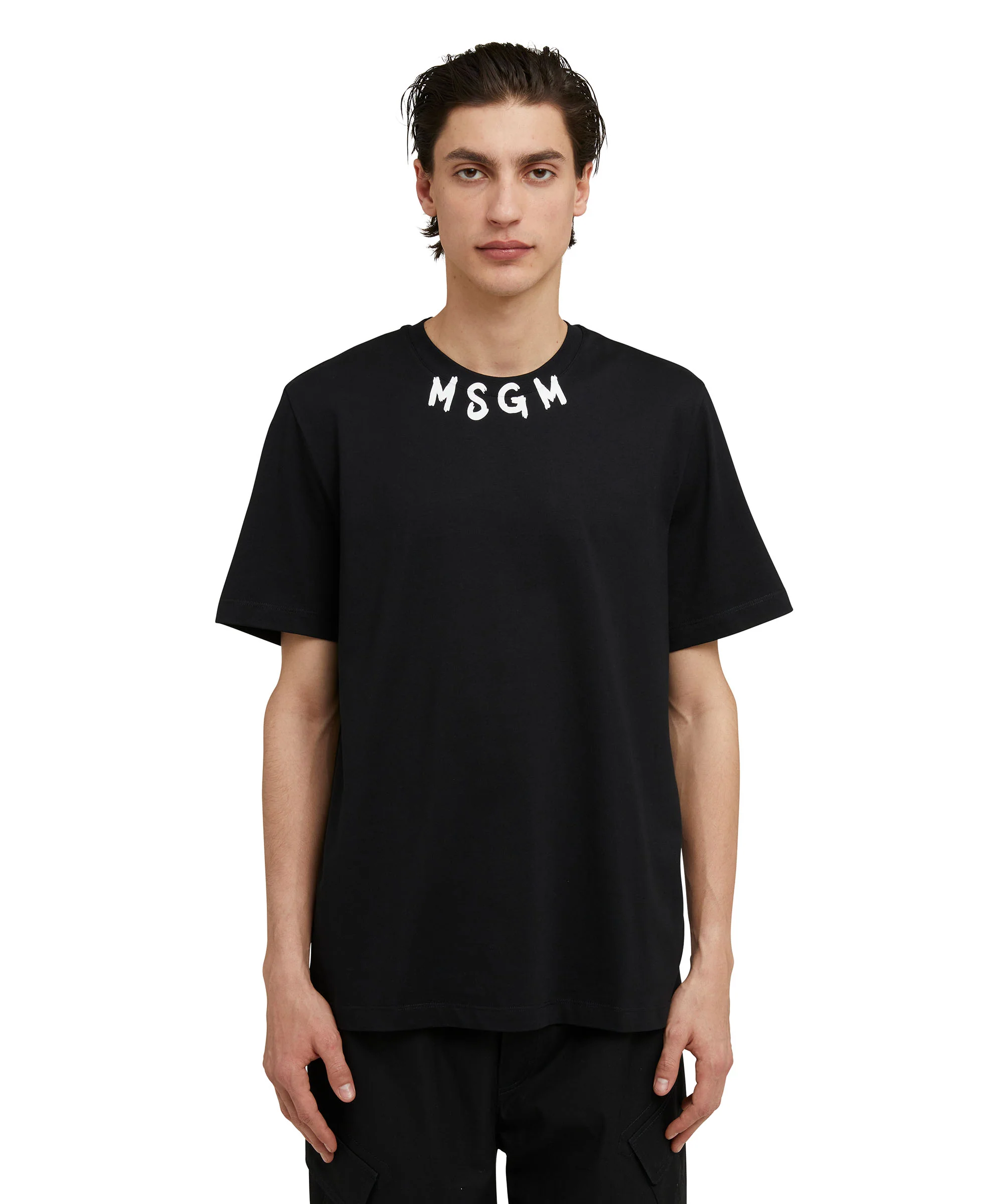 Solid color cotton crewneck t-shirt with contrasting color brushed MSGM logo at the neckline. Short sleeves and ribbed collar. Regular fit.