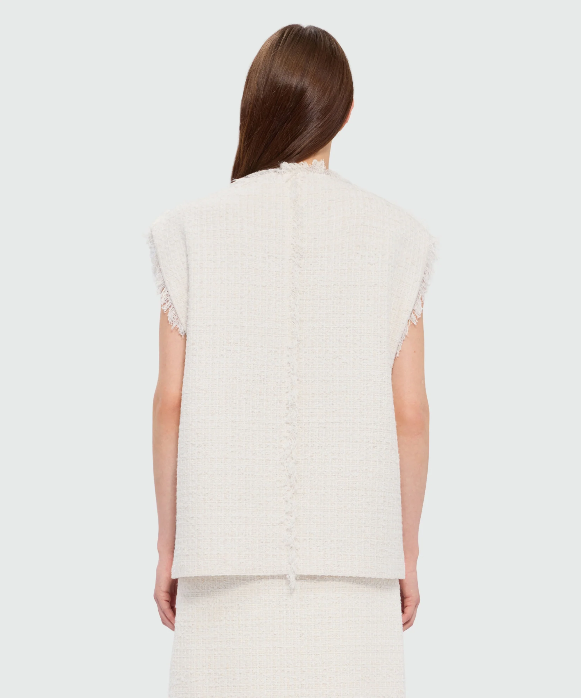 Boucle tweed-effect vest with front metal button closure, large front patch pocket with rivets, and fringed edges. Oversized fit.The model is wearing a size S/40.